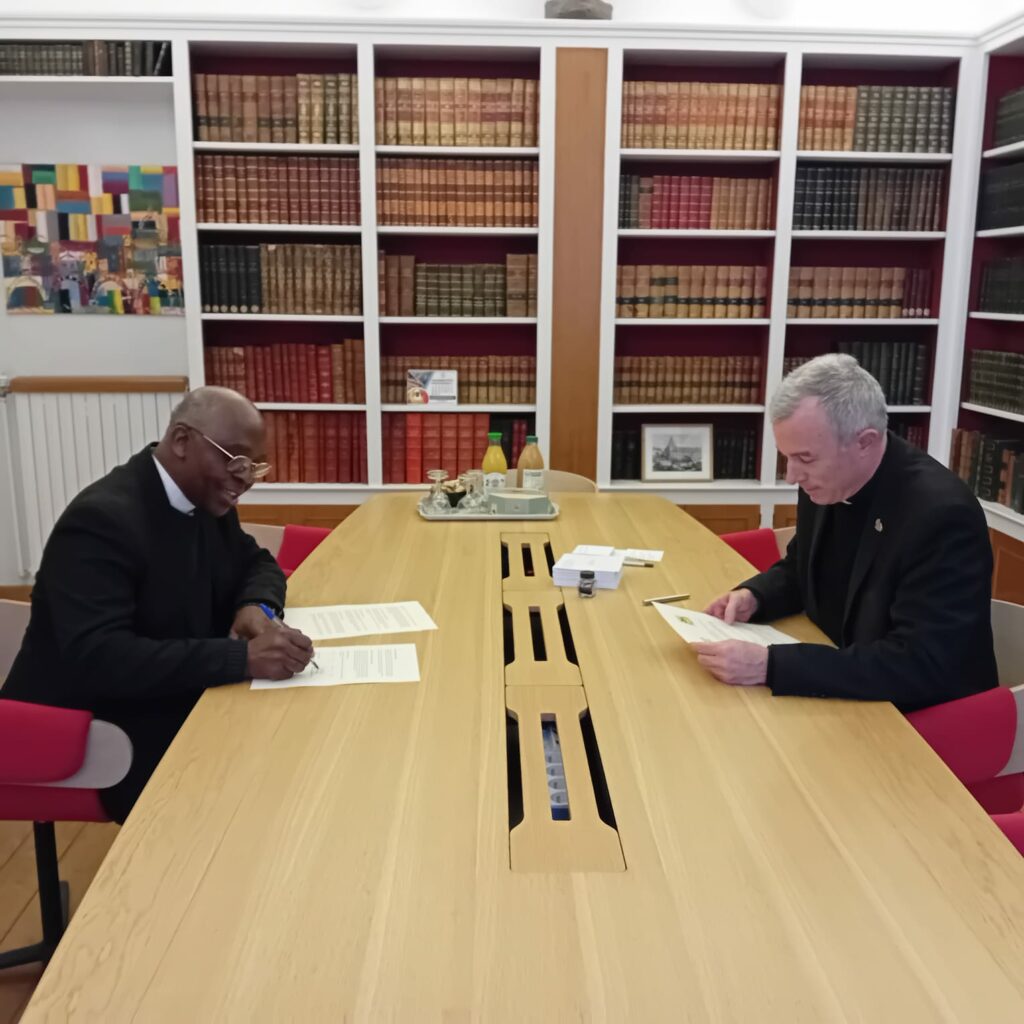 En mission en France, le Professeur A. Léonard Santedi, Recteur de l’Université Catholique du Congo (UCC) et le Professeur P. Emmanuel Petit, Recteur de l’institut Catholique de Paris (ICP), viennent de signer une nouvelle convention de partenariat qui prévoit l’échange des étudiants du 1er et du 2ème cycles, ainsi que la mobilité des professeurs. Déjà un projet est en marche pour accueillir des étudiants et chercheurs de l’ICP et pour des thèses de co-tutelle et des